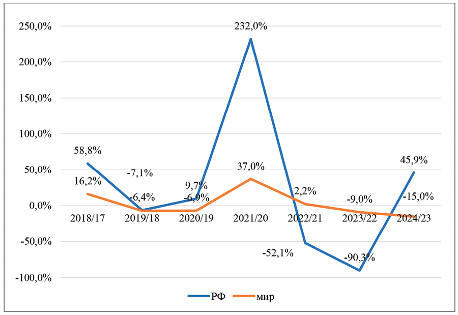 Российский рынок венчурных инвестиций характеризуется высокой волатильностью, значительно уступая мировым показателям как по объему, так и по среднему размеру сделок. Несмотря на кратковременный всплеск в 2021 г., в последующие годы наблюдается спад, тогда как мировая индустрия в целом демонстрирует устойчивый рост и большую стабильность.