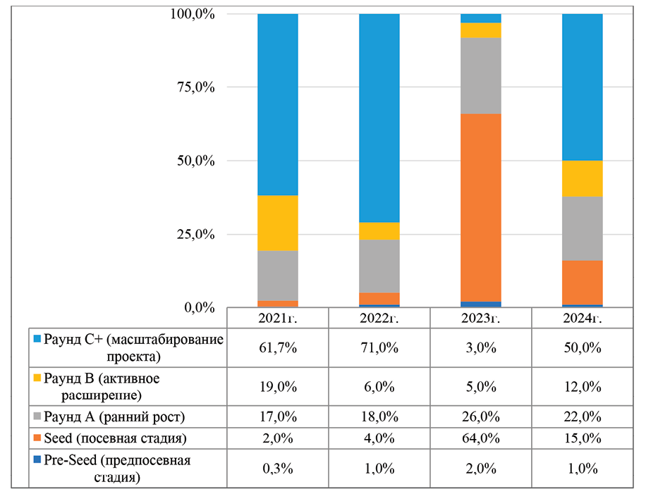 Как следует из данных рис. 3, в 2023 г., по сравнению с 2022 г., инвестиции увеличились только на этапе Seed. В 2024 г. структура венчурного финансирования стала восстанавливаться, однако последствия ухода крупного иностранного капитала полностью не устранены.